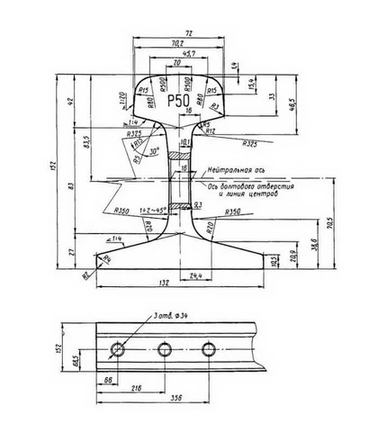 Рельс Р50 входит в категорию материалов для строительства железнодорожных путей широкой колеи, а его маркировка указывает на округленную массу одного погонного метра такого ж/д проката (51,8 килограмм) Ближайшие аналоги этого двутавра – Р43 и P65 – изделия соответственно меньшей и большей относительной массы, что объясняет наличие в материале универсальных эксплуатационных характеристик, существенно расширяющих сферу его применения.